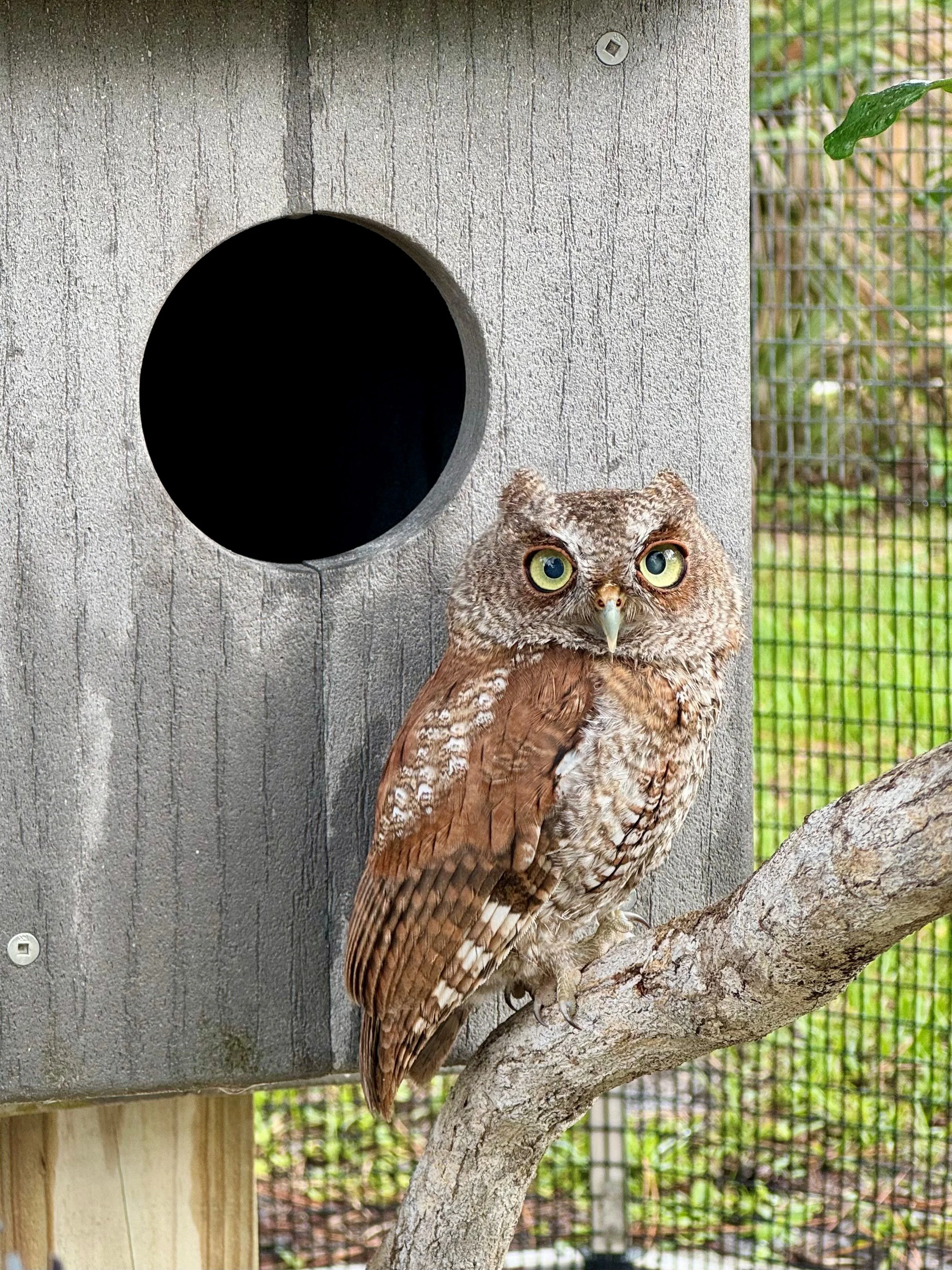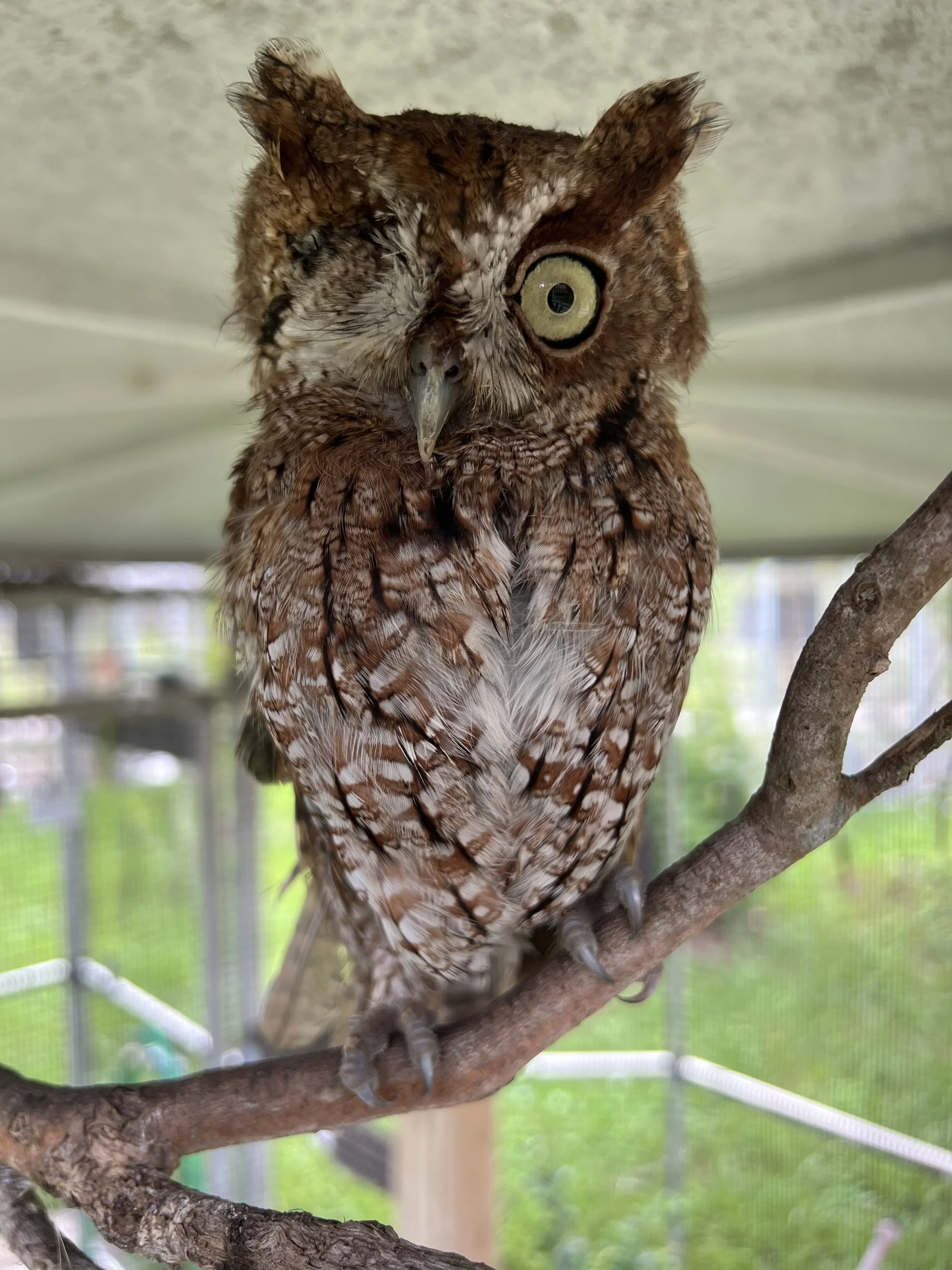 Luna is one of the Eastern Screech Owls at Busch Wildlife Sanctuary. Luna was brought into our wildlife rehabilitation center as an orphaned juvenile in March 2025 after residents found her grounded and unwilling to open her eyes. Staff discovered she has bilateral cataracts, severely impacting her vision, and she was deemed non-releasable.