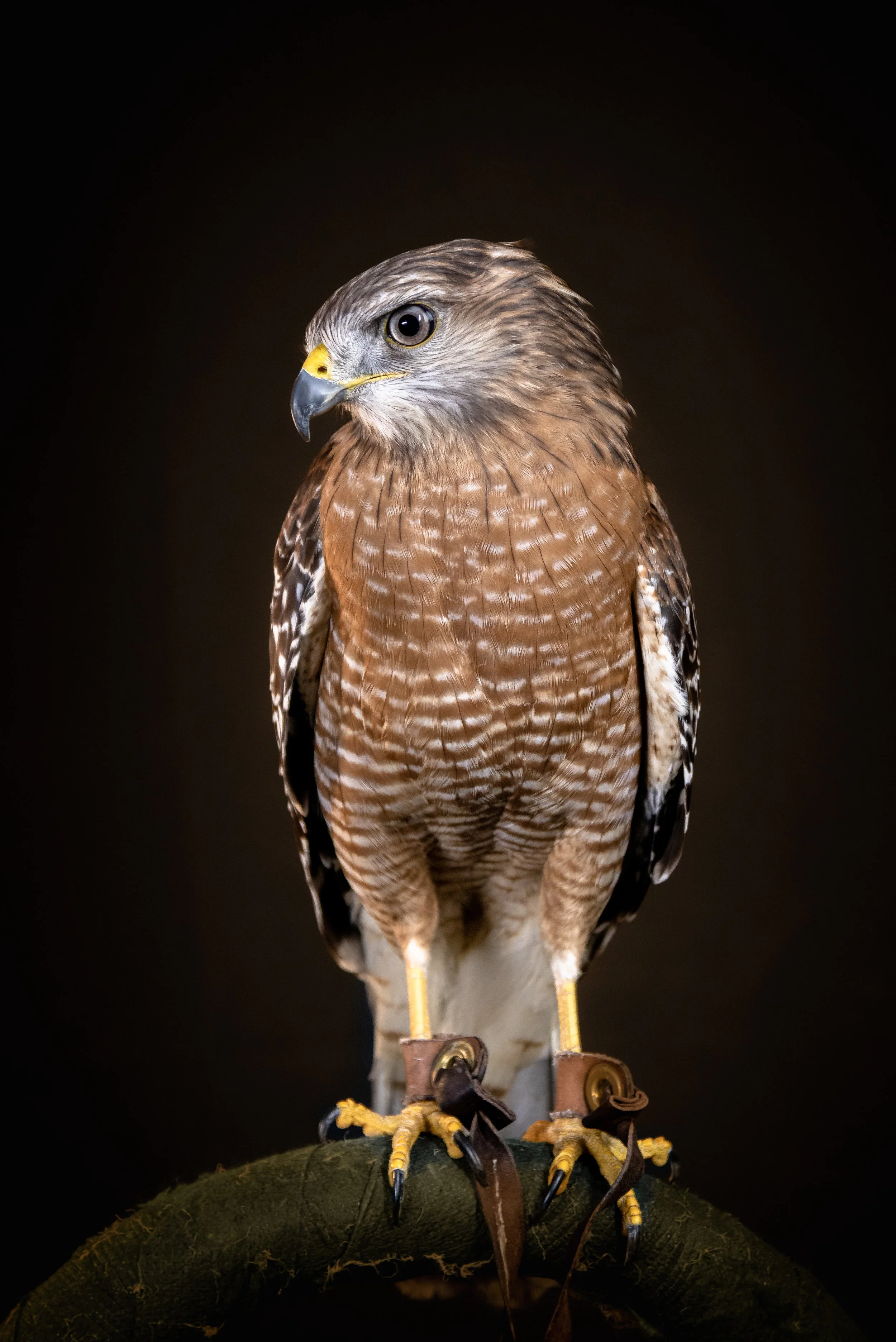 These hawks are characterized by their broad wings that are adapted for soaring flight, and Squeaks’ injury prevents him from having a strong, sustained flight. Although we aren’t exactly sure how Squeaks was injured, Red-shouldered Hawks are known to nest high up in trees, and he may have fallen.
