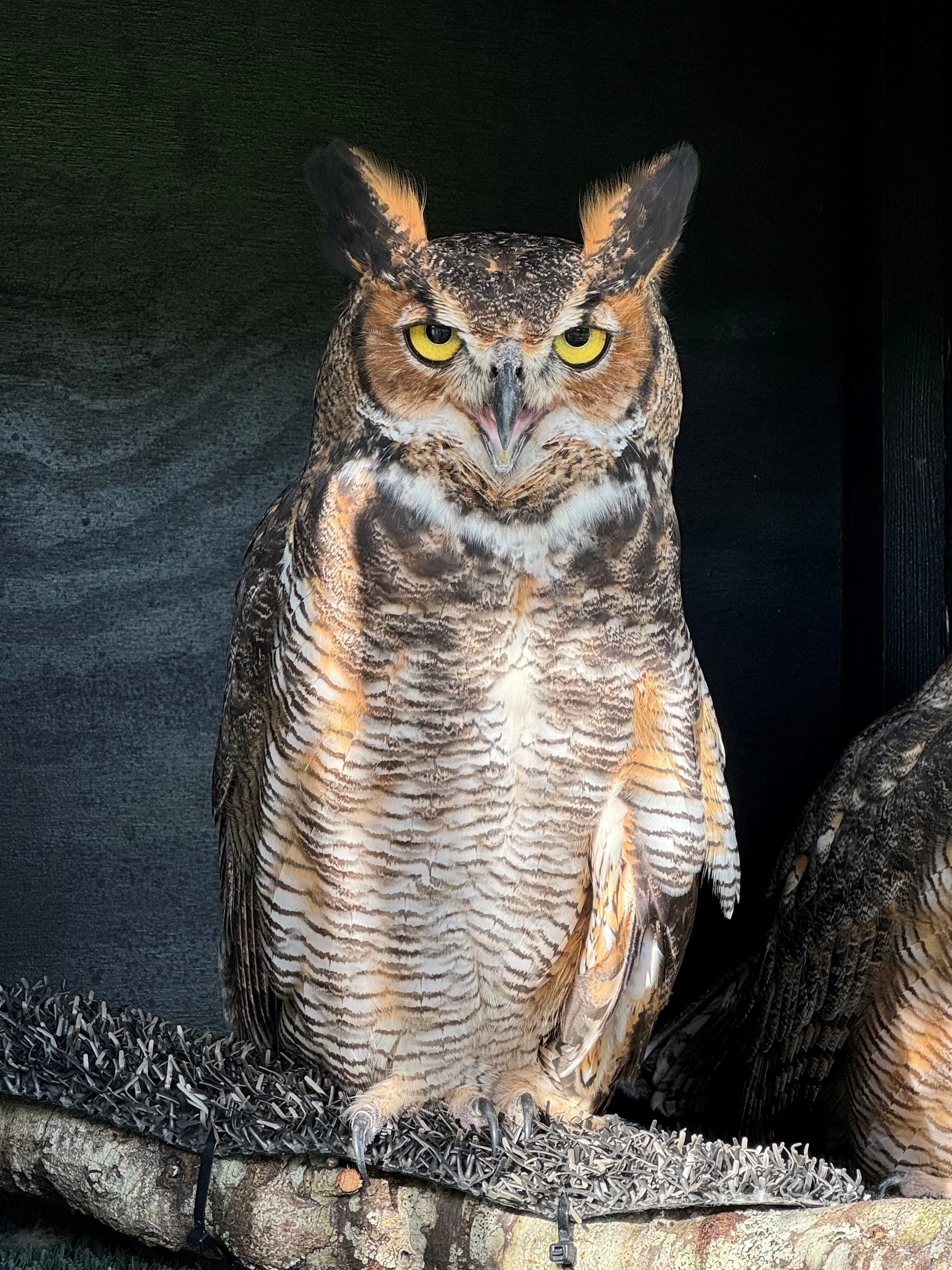 Schmo is one of the Great Horned Owls at Busch Wildlife Sanctuary. Schmo was brought into our wildlife rehabilitation center with an injured wing, but we aren’t entirely sure how it was initially damaged. Though the wing healed, Schmo does not fly as well as he should, and was deemed non-releasable.
