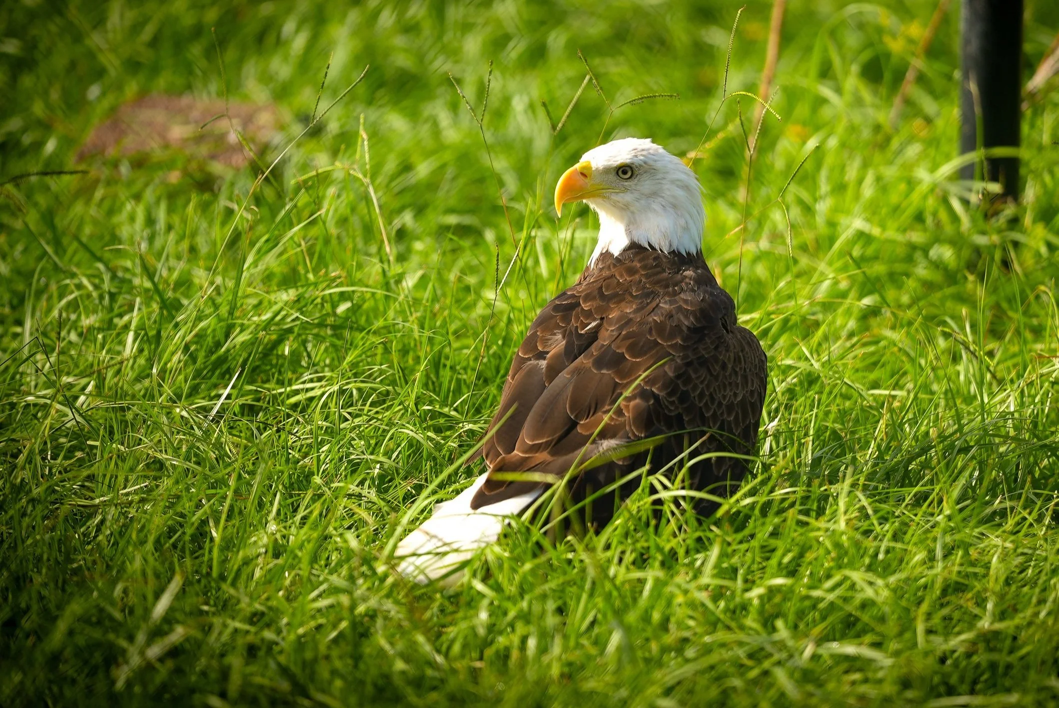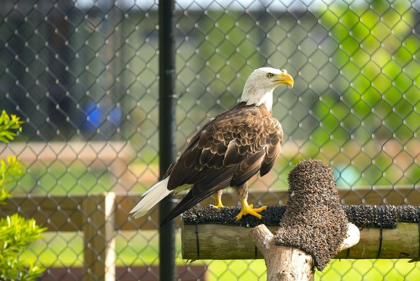Orange is one of the Bald Eagles at Busch Wildlife Sanctuary. Orange was brought to our wildlife rehabilitation center where our staff discovered he suffered a permanent wing injury. He was deemed non-releasable because he could not fly well.