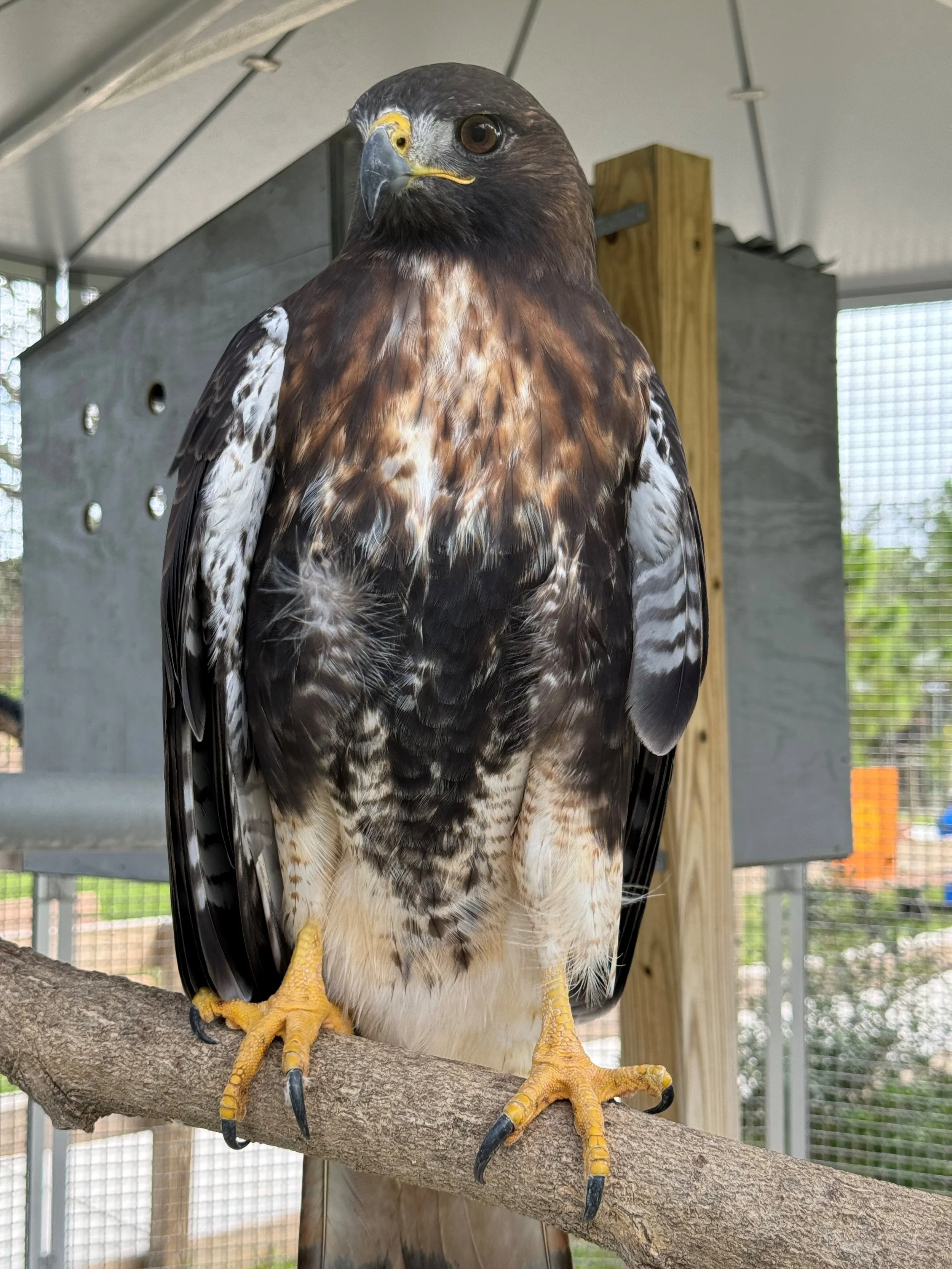 Wolfgang is one of the Red-tailed Hawks at Busch Wildlife Sanctuary. Wolfgang was caught in chicken wire and brought to our rehabilitation center. She suffered a permanent eye injury and had to have it removed. Because Wolfgang now only has one eye, she is not releasable.