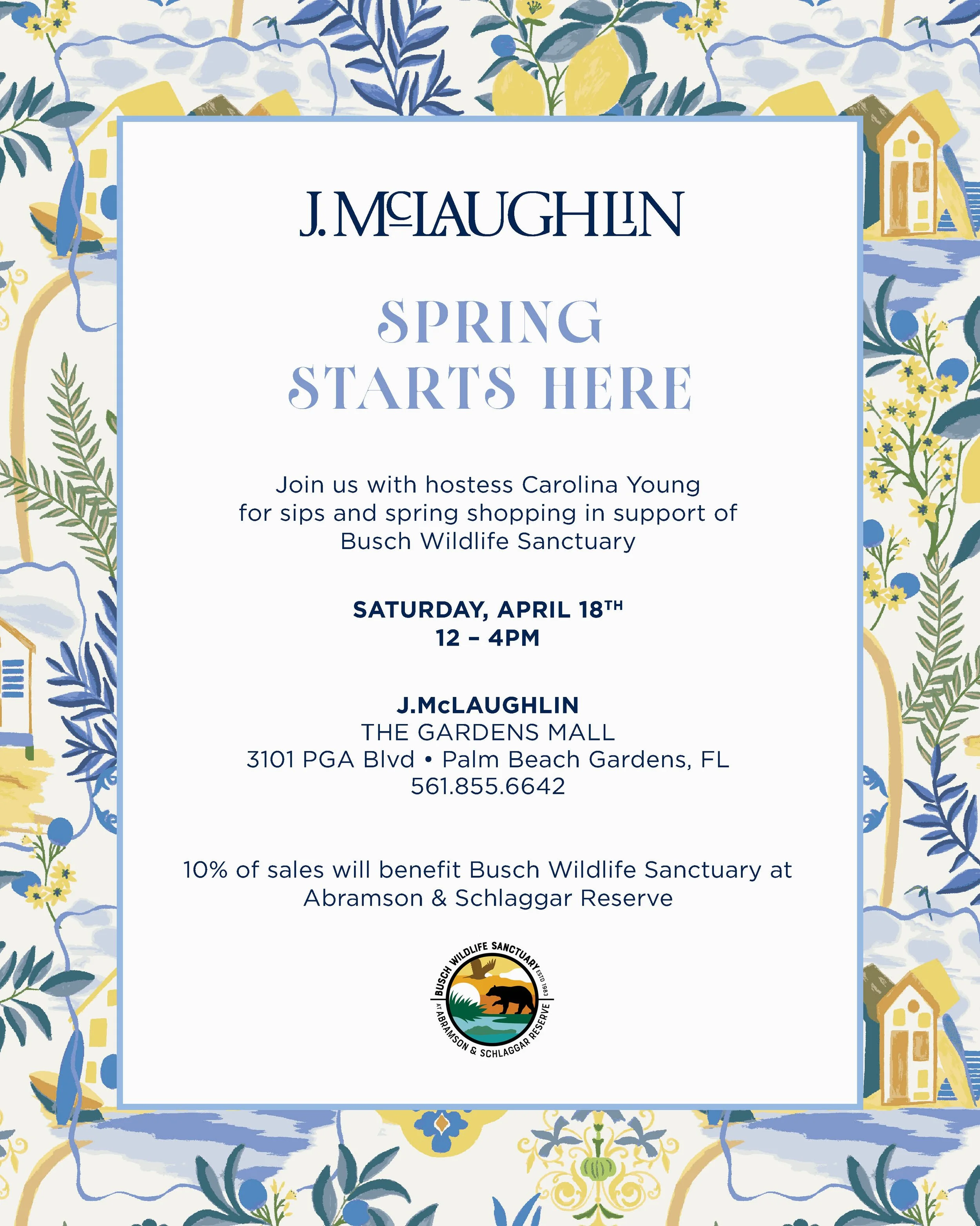 Back to All Events Sip & Shop: J. McLaughlin at the Gardens Mall Saturday, April 18, 2026 12:00 PM 2:00 PM The Gardens Mall 3101 PGA Boulevard Palm Beach Gardens, FL, 33410 United States (map) Google Calendar ICS Join Busch Wildlife Sanctuary at J McLaughlin for spring shopping and meet some of our animal ambassadors. A portion of the afternoon's sales will be donated back to our organization.