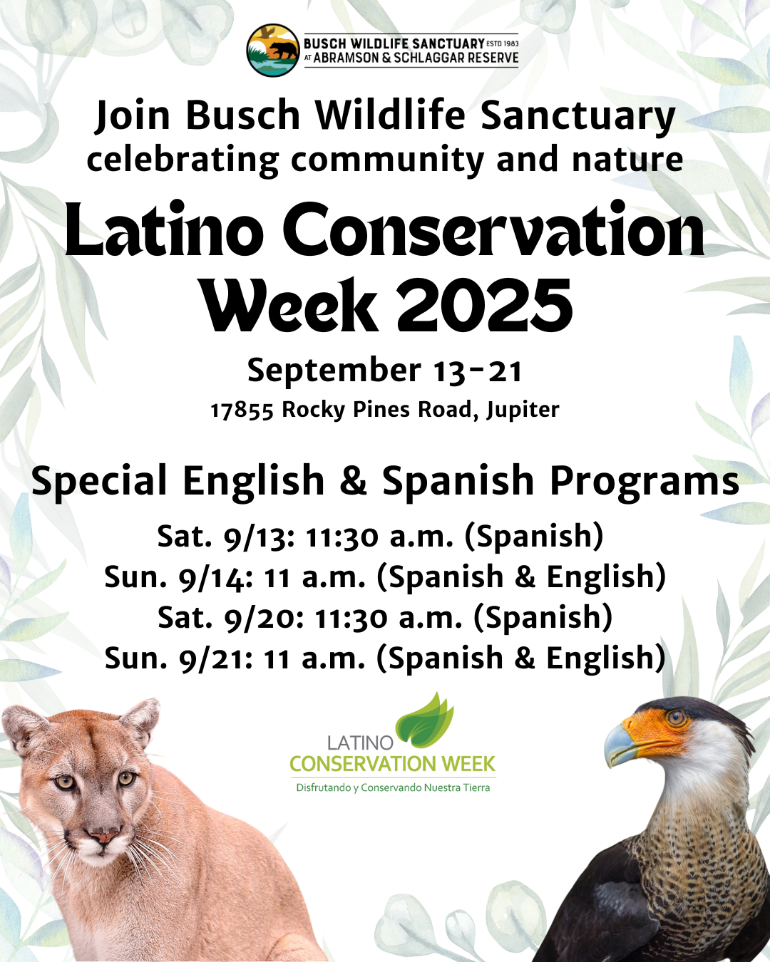 Latino Conservation Week 2025 Saturday, September 13, 2025 10:00 AM Sunday, September 21, 2025 4:30 PM Busch Wildlife Sanctuary 17855 Rocky Pines Road Jupiter, FL, 33478 United States (map) Google Calendar ICS