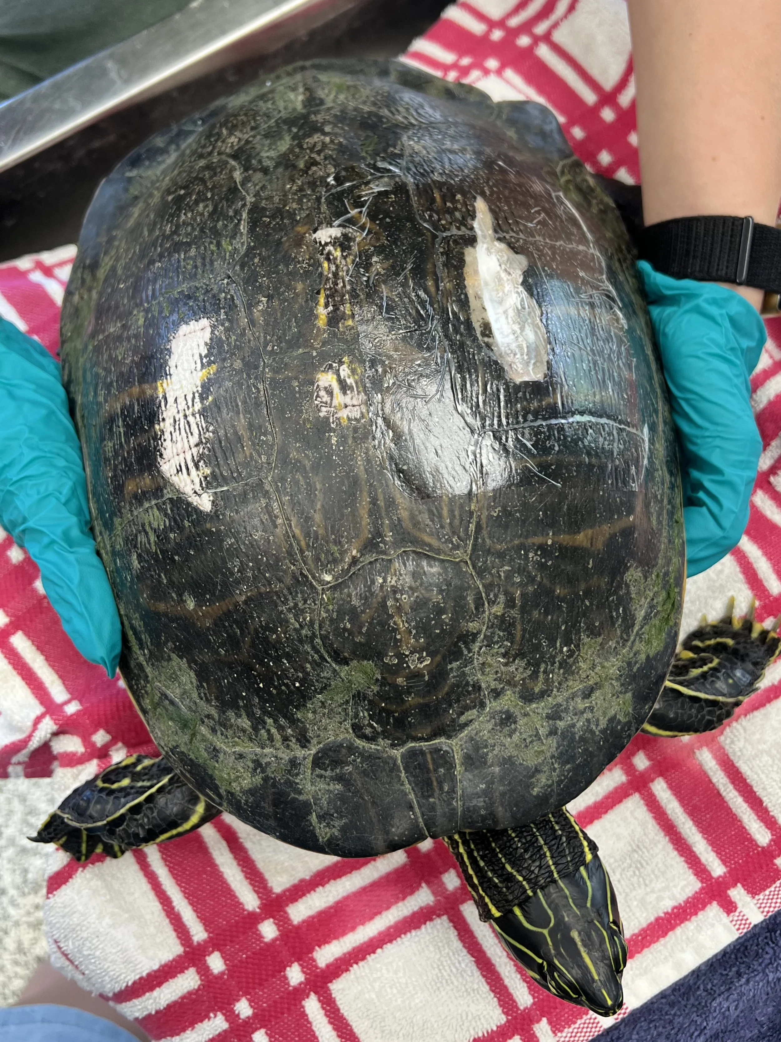 This injured yellow-bellied slider was brought in on June 15. She was found upside down in the middle of the street in Boynton Beach.